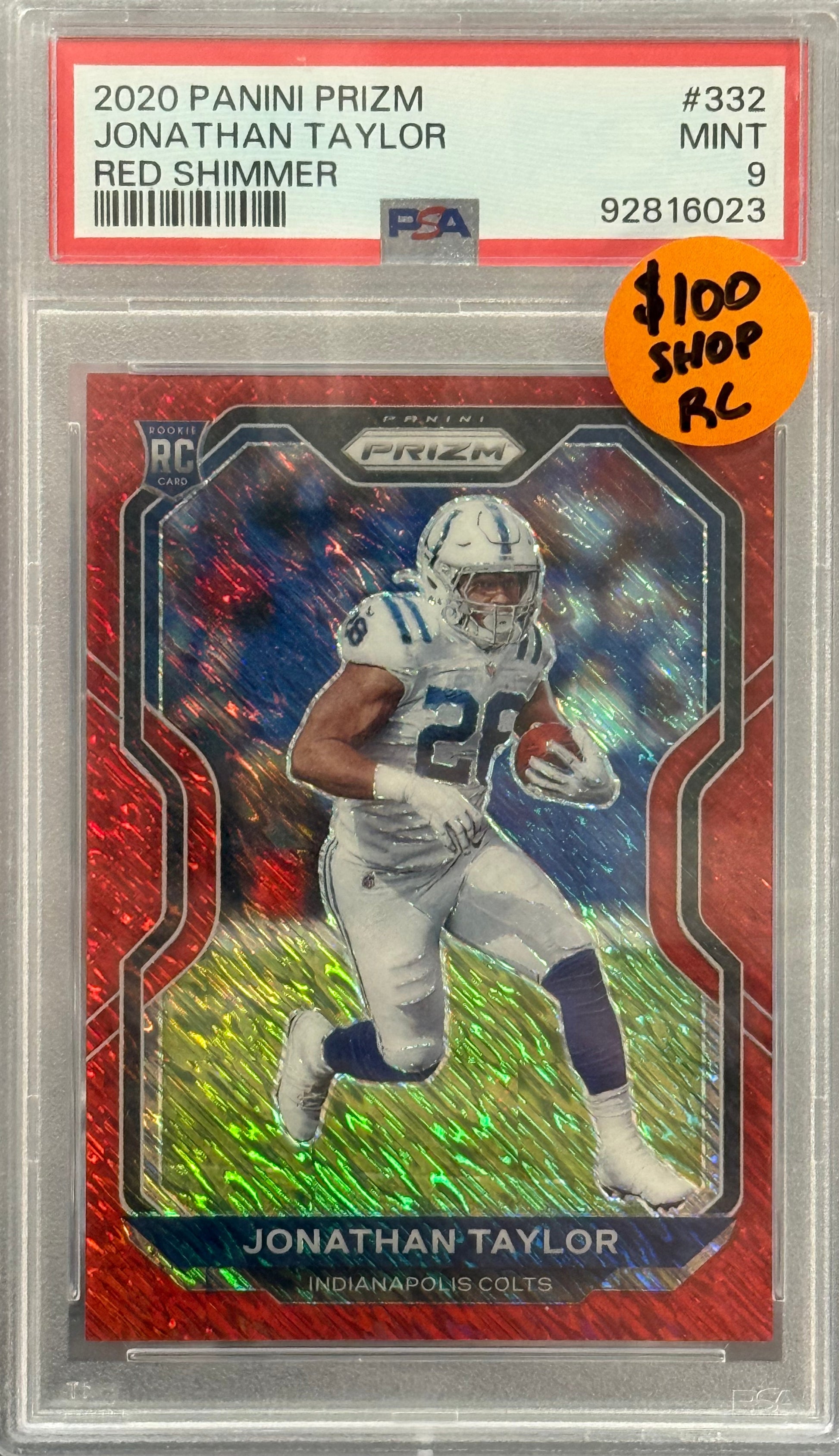 Add a standout rookie card to your collection with this 2020 Panini Prizm Jonathan Taylor Red Shimmer, graded PSA 9 (Mint). Featuring the vibrant Red Shimmer parallel, this card highlights Taylor’s breakout rookie season in premium condition. PSA certification guarantees authenticity, making it a must-have collectible for display, investment, or any high-end football card collection.