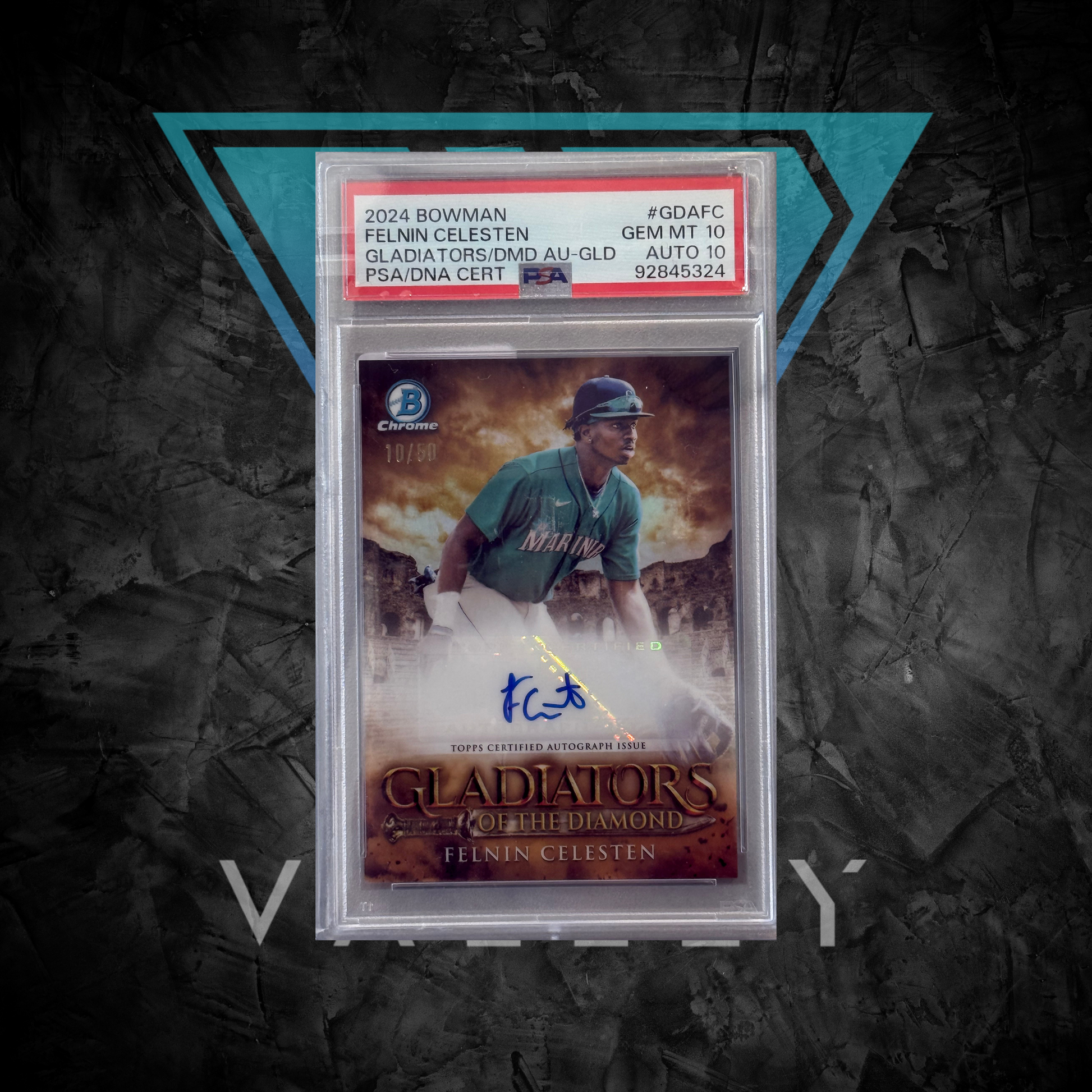 Step up your collecting game with this 2024 Bowman Felnin Celesten Gladiator Autograph, graded PSA GM MT 10 / AUTO 10. Featuring Celesten’s on-card signature and the striking Gladiator parallel, this card delivers both aesthetic appeal and investment potential. PSA grading guarantees flawless condition and autograph authenticity, making it a top-tier addition for collectors and prospect enthusiasts.
